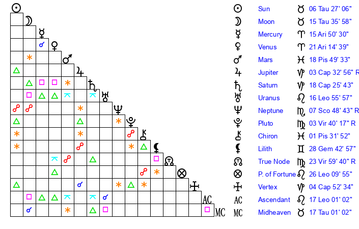 | Moon | 15 Taurus 28 | 21 Aries 2 | 21 Virgo 36 |