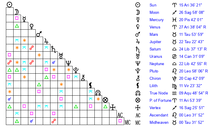 | Sun | 15 Aries 36 | 16 Aries 9 | 25 Gemini 13 |
