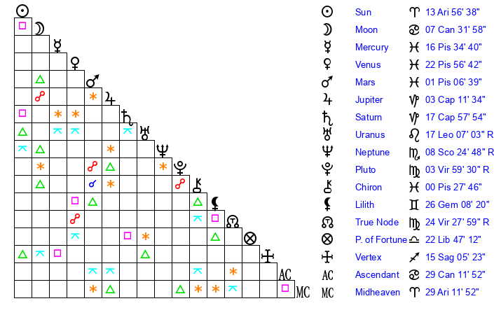 | Sun | 13 Aries 56 | 14 Aries 11 | 16 Gemini 55 |