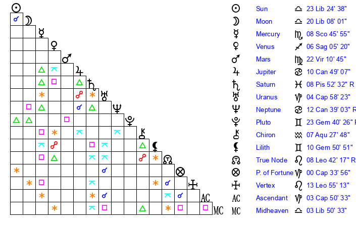 | Sun | 23 Libra 25 | 24 Libra 34 | 23 Aquarius 52 |