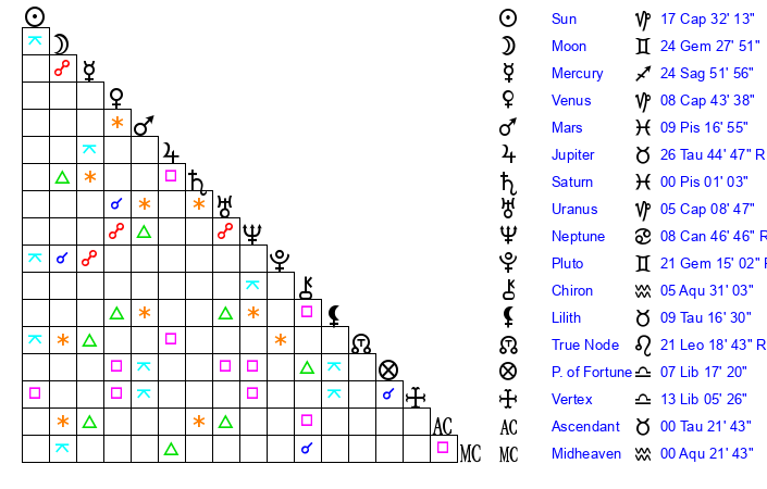 | Sun | 17 Capricorn 32 | 18 Capricorn 40 | 16 Taurus 13 |