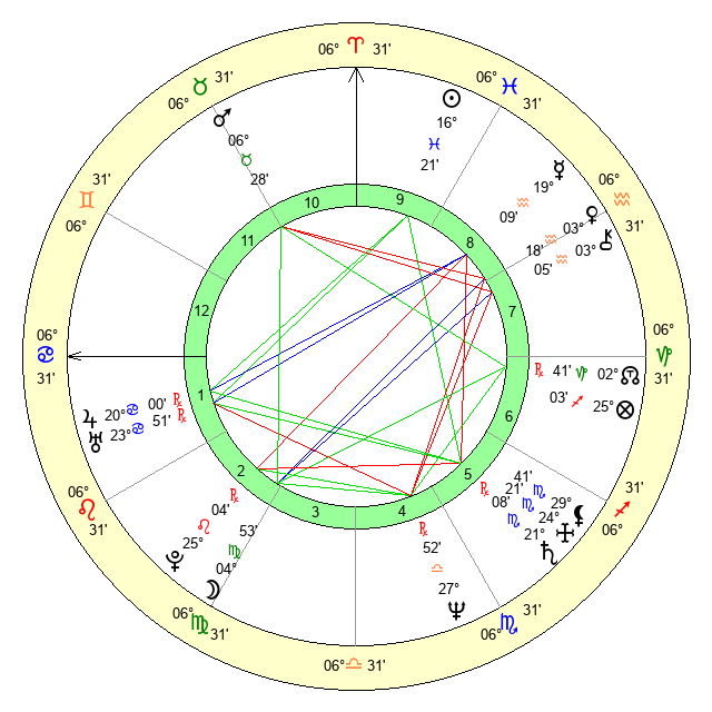 | Moon | 4 Virgo 51 | 0 Cancer 21 | 14 Pisces 44 |