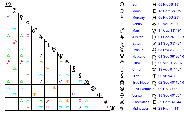 | Moon | 18 Gemini 20 | 4 Pisces 55 | 14 Sagittarius 37 |