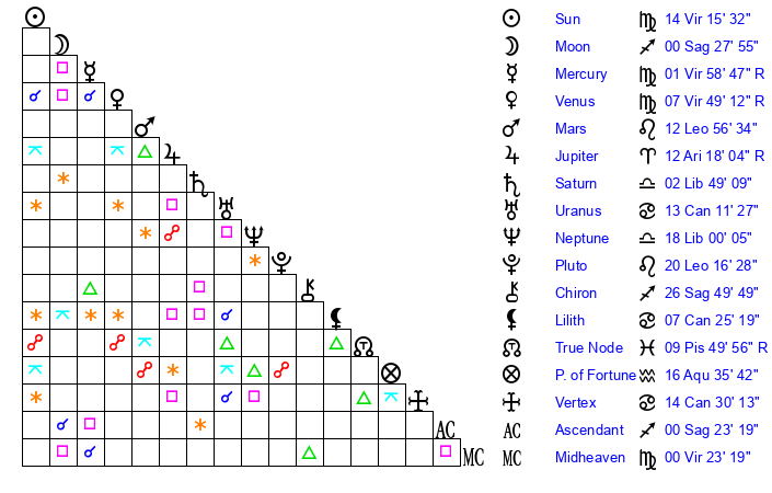| Sun | 14 Virgo 15 | 15 Virgo 19 | 27 Scorpio 34 |