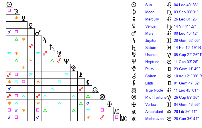 | Mercury | 26 Leo 1 | 11 Leo 24 | 13 Sagittarius 38 |