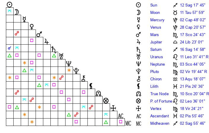 | Saturn | 16 Sagittarius 37 | 25 Pisces 6 | 23 Sagittarius 51 |
