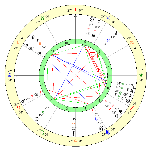 | Moon | 15 Virgo 24 | 27 Taurus 52 | 22 Pisces 42 |