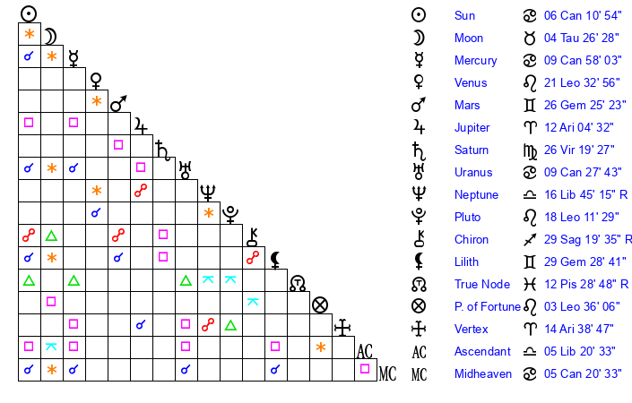 | Mercury | 9 Cancer 58 | 2 Leo 25 | 1 Virgo 41 |