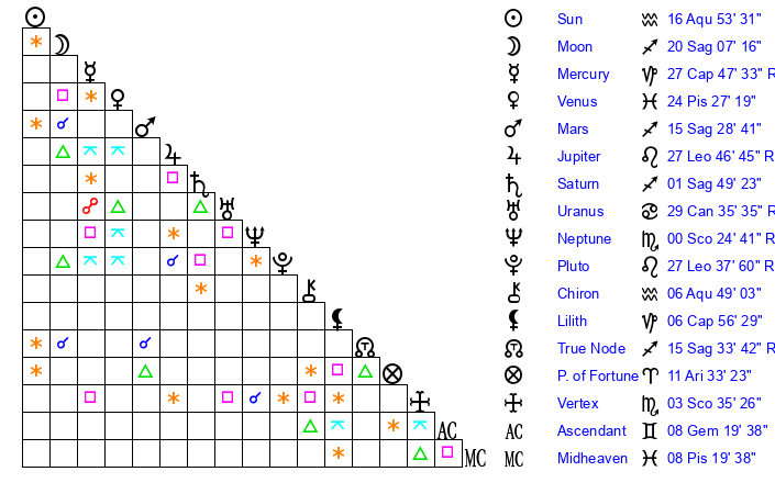 | Sun | 16 Aquarius 53 | 18 Aquarius 9 | 25 Aries 41 |