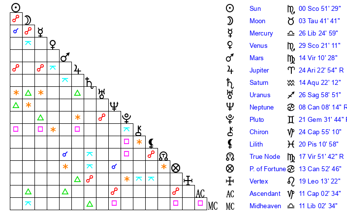 | Moon | 3 Taurus 48 | 6 Sagittarius 19 | 14 Libra 7 |