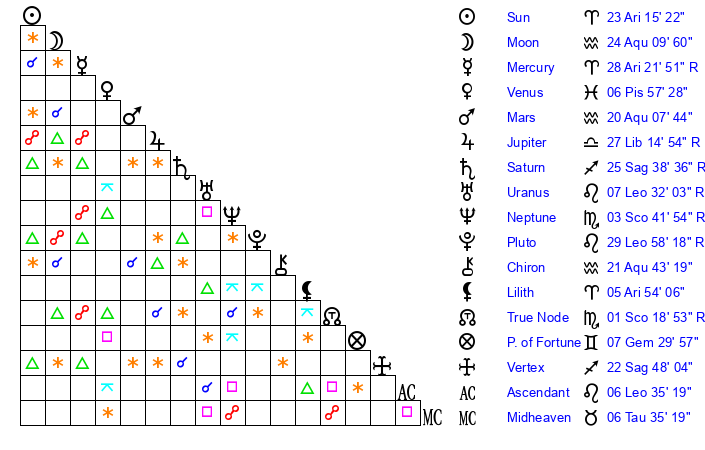 | Sun | 23 Aries 15 | 24 Aries 1 | 27 Gemini 53 |