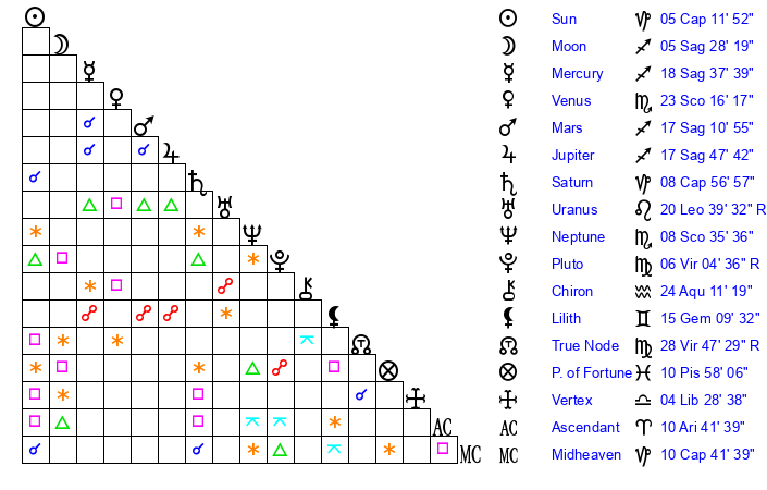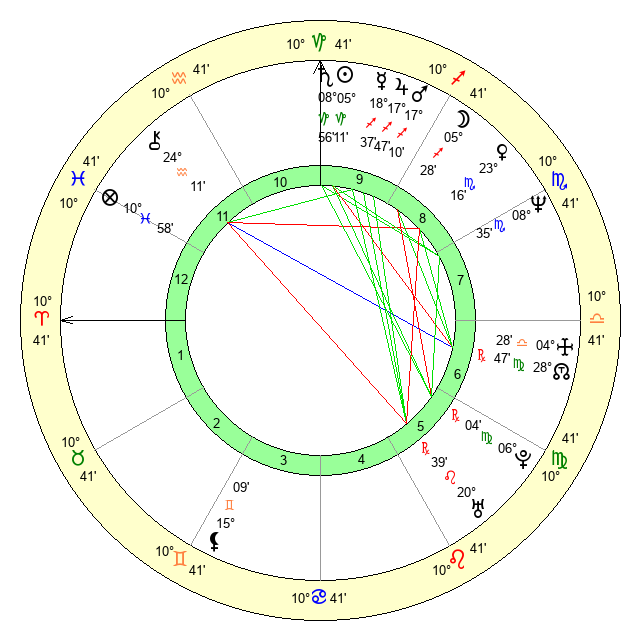 | Pluto | 6 Virgo 3 | 0 Aquarius 56 | 4 Virgo 43 |