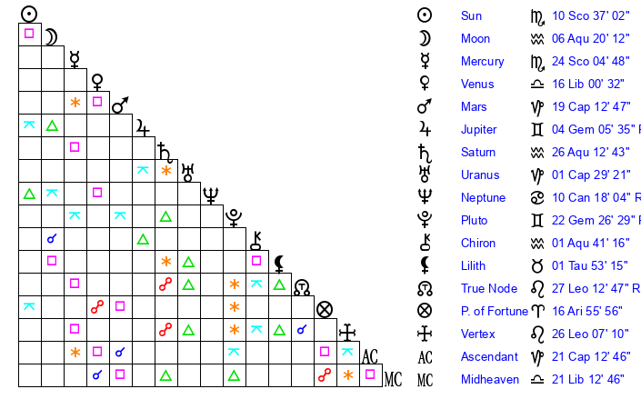 | Saturn | 26 Aquarius 41 | 25 Pisces 34 | 6 Pisces 40 |