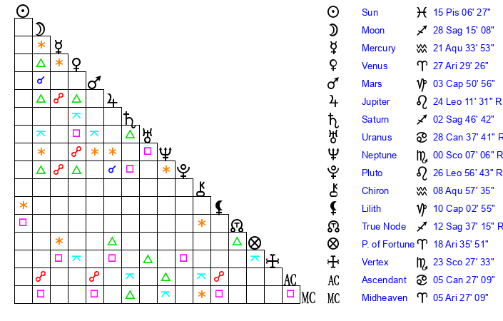 | Saturn | 3 Sagittarius 14 | 21 Pisces 11 | 0 Sagittarius 32 |