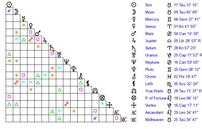 | Sun | 17 Taurus 12 | 18 Taurus 21 | 7 Virgo 23 |