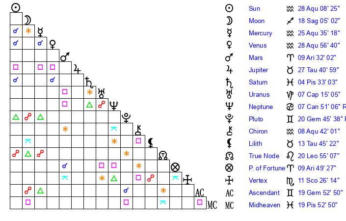 | Sun | 28 Aquarius 9 | 29 Aquarius 17 | 24 Gemini 36 |