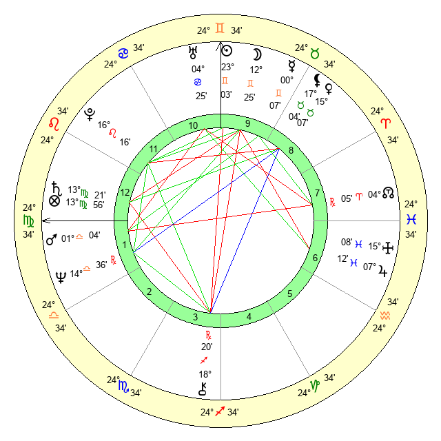 | Sun | 23 Gemini 3 | 23 Gemini 53 | 4 Virgo 48 |