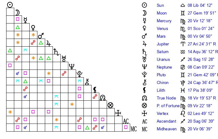 | Moon | 27 Gemini 14 | 28 Capricorn 27 | 14 Sagittarius 7 |