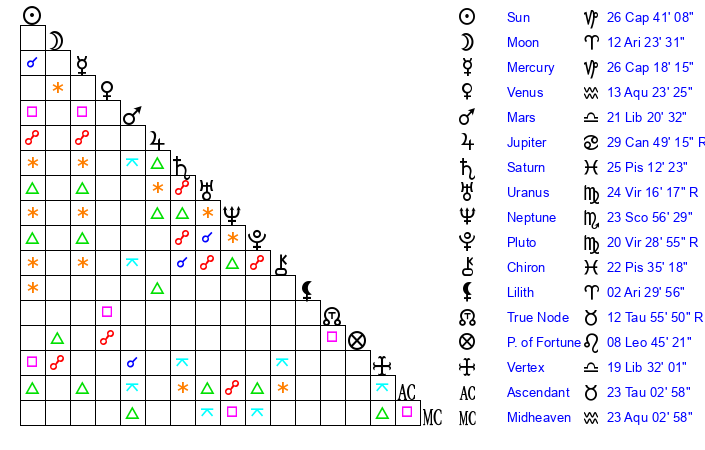 Sun | 26 Capricorn 41 | 27 Capricorn 37 | 25 Pisces 13 |