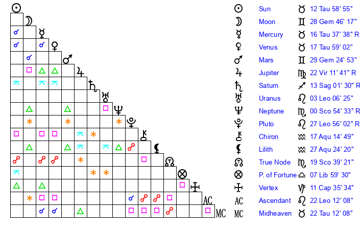 | Sun | 12 Taurus 59 | 13 Taurus 30 | 18 Cancer 9 |