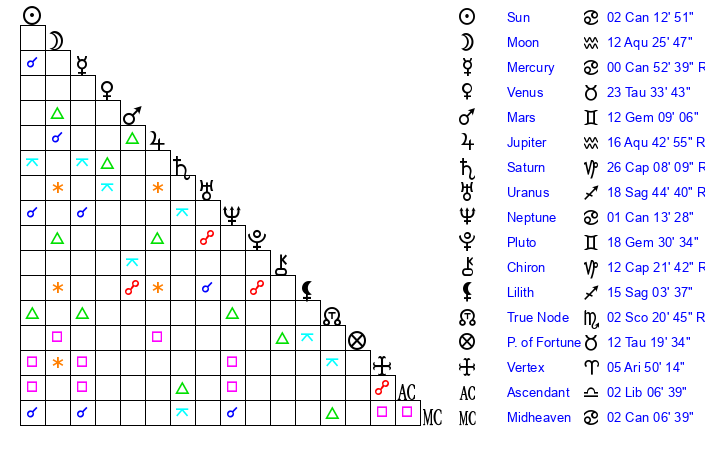 | Jupiter | 16 Aquarius 23 | 3 Cancer 23 | 7 Aquarius 51 |