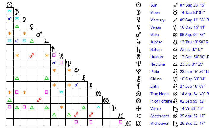 | Moon | 14 Taurus 53 | 25 Pisces 25 | 5 Capricorn 37 |