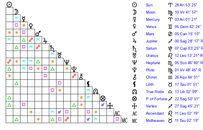 | Jupiter | 0 Sagittarius 19 | 19 Gemini 11 | 22 Scorpio 57 |