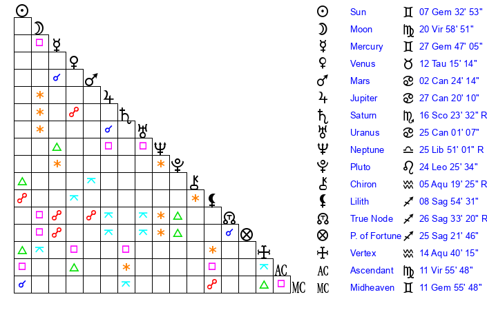 | Sun | 7 Gemini 32 | 8 Gemini 34 | 14 Leo 24 |