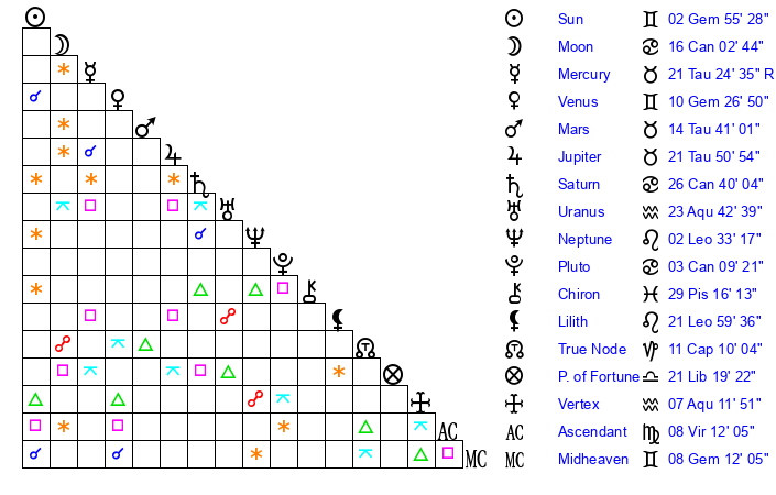 | Moon | 15 Cancer 59 | 29 Aries 41 | 2 Cancer 48 |