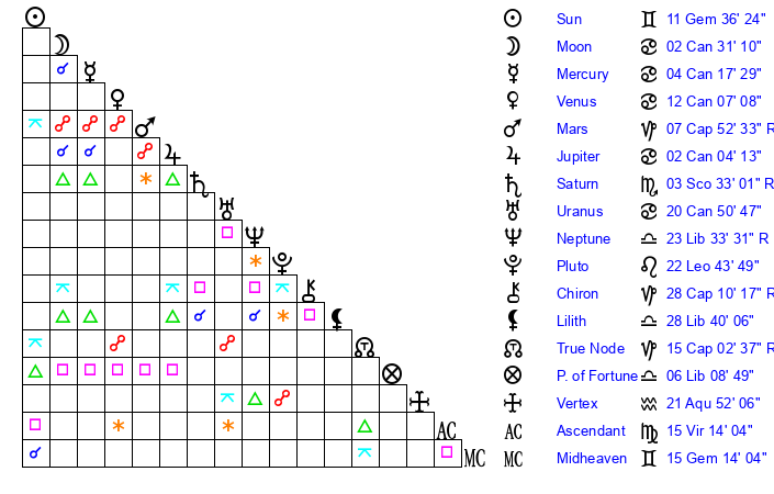 | Mercury | 4 Cancer 17 | 16 Gemini 47 | 9 Leo 46 |