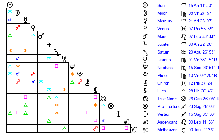 | Sun | 15 Aries 11 | 16 Aries 9 | 15 Gemini 16 |