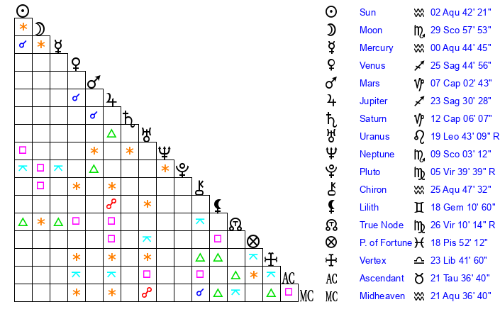 | Neptune | 9 Scorpio 2 | 27 Pisces 44 | 8 Scorpio 32 |
