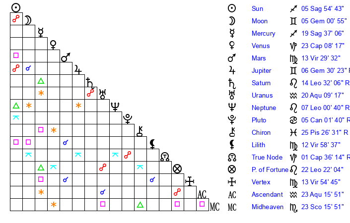 | Sun | 5 Sagittarius 54 | 6 Sagittarius 43 | 25 Pisces 18 |