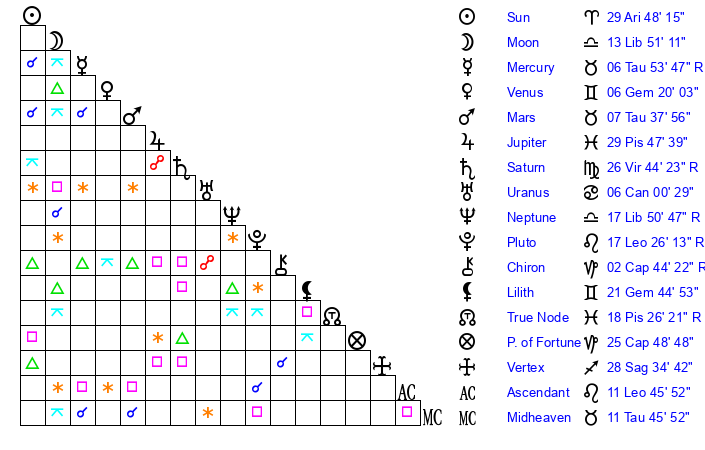 | Moon | 13 Libra 53 | 26 Capricorn 25 | 4 Cancer 13 |