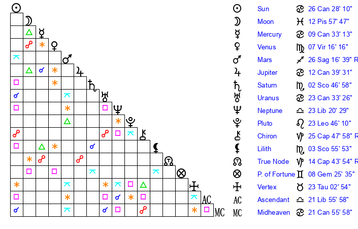 | Sun | 26 Cancer 28 | 27 Cancer 16 | 5 Libra 1 |