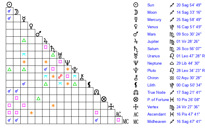 | Sun | 20 Sagittarius 55 | 21 Sagittarius 56 | 2 Pisces 3 |