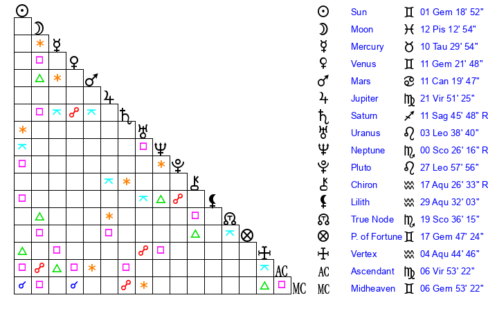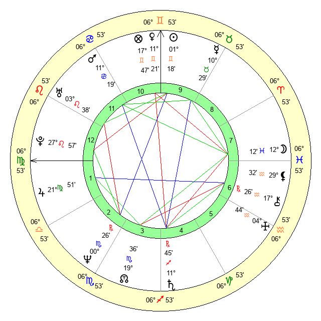 | Sun | 1 Gemini 19 | 1 Gemini 51 | 6 Leo 17 |