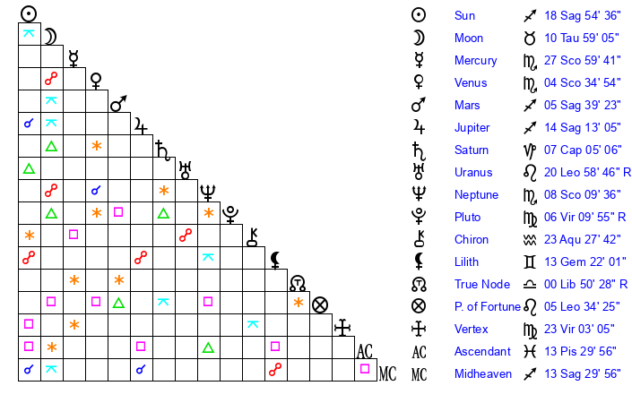 | Jupiter | 14 Sagittarius 7 | 23 Cancer 42 | 27 Sagittarius 37 |