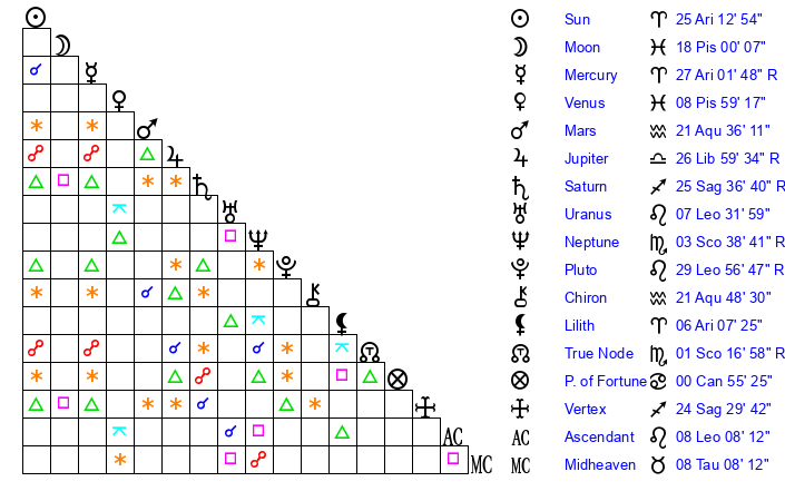 | Moon | 17 Pisces 55 | 25 Scorpio 10 | 24 Leo 37 |