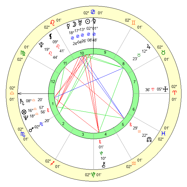 | Moon | 16 Cancer 59 | 8 Gemini 40 | 20 Pisces 3 |