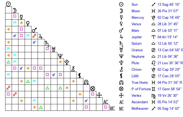 | Sun | 13 Sagittarius 46 | 14 Sagittarius 49 | 28 Aquarius 59 |