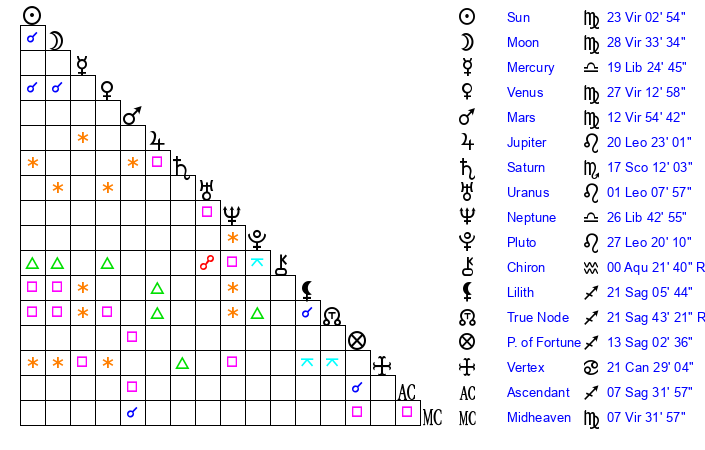 | Sun | 23 Virgo 2 | 24 Virgo 5 | 2 Sagittarius 39 |