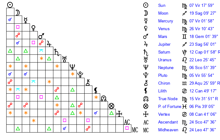 | Sun | 7 Virgo 18 | 7 Virgo 34 | 11 Scorpio 17 |