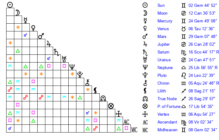 | Sun | 2 Gemini 44 | 3 Gemini 46 | 9 Leo 37 |