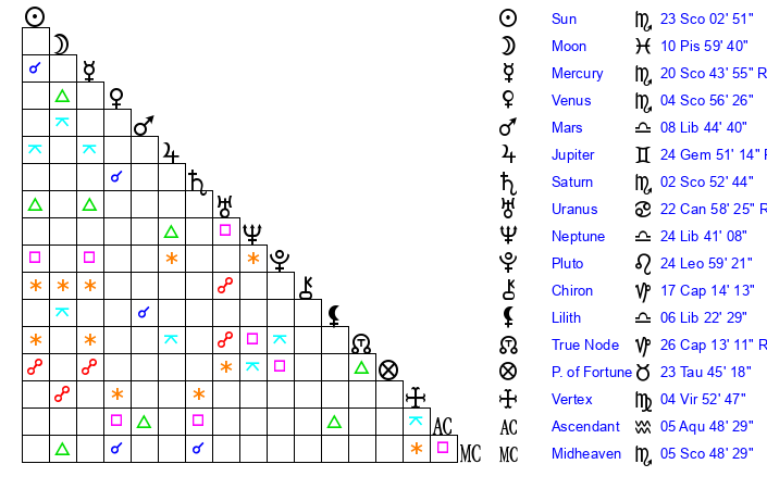 | Moon | 11 Pisces 5 | 3 Libra 37 | 1 Scorpio 21 |