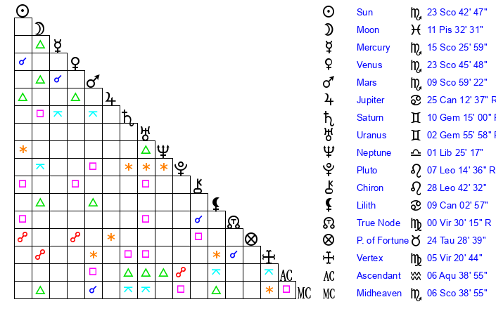| Sun | 23 Scorpio 43 | 24 Scorpio 35 | 18 Aquarius 3 |