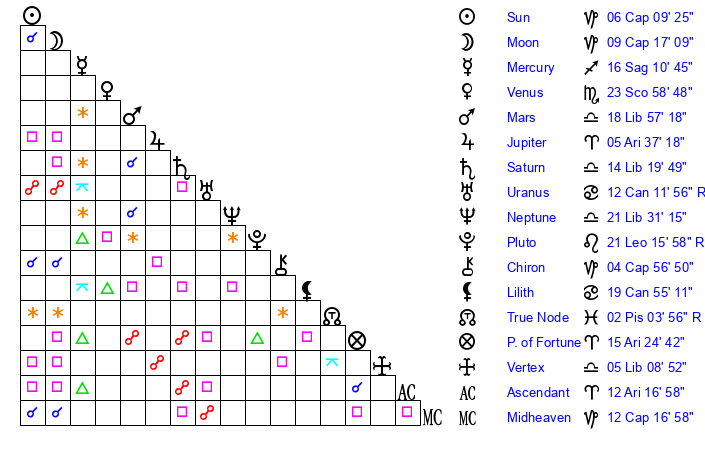 | Moon | 9 Capricorn 10 | 10 Sagittarius 59 | 8 Virgo 13 |
