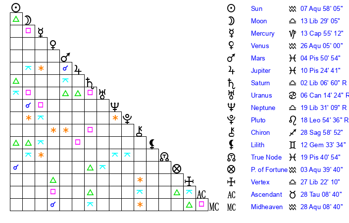 | Saturn | 2 Libra 39 | 17 Pisces 0 | 27 Virgo 49 |