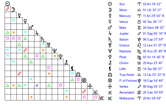 | Sun | 3 Aries 18 | 4 Aries 18 | 7 Gemini 34 |