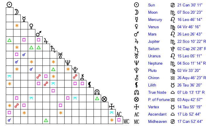 | Pluto | 2 Virgo 32 | 2 Aquarius 49 | 4 Virgo 39 |